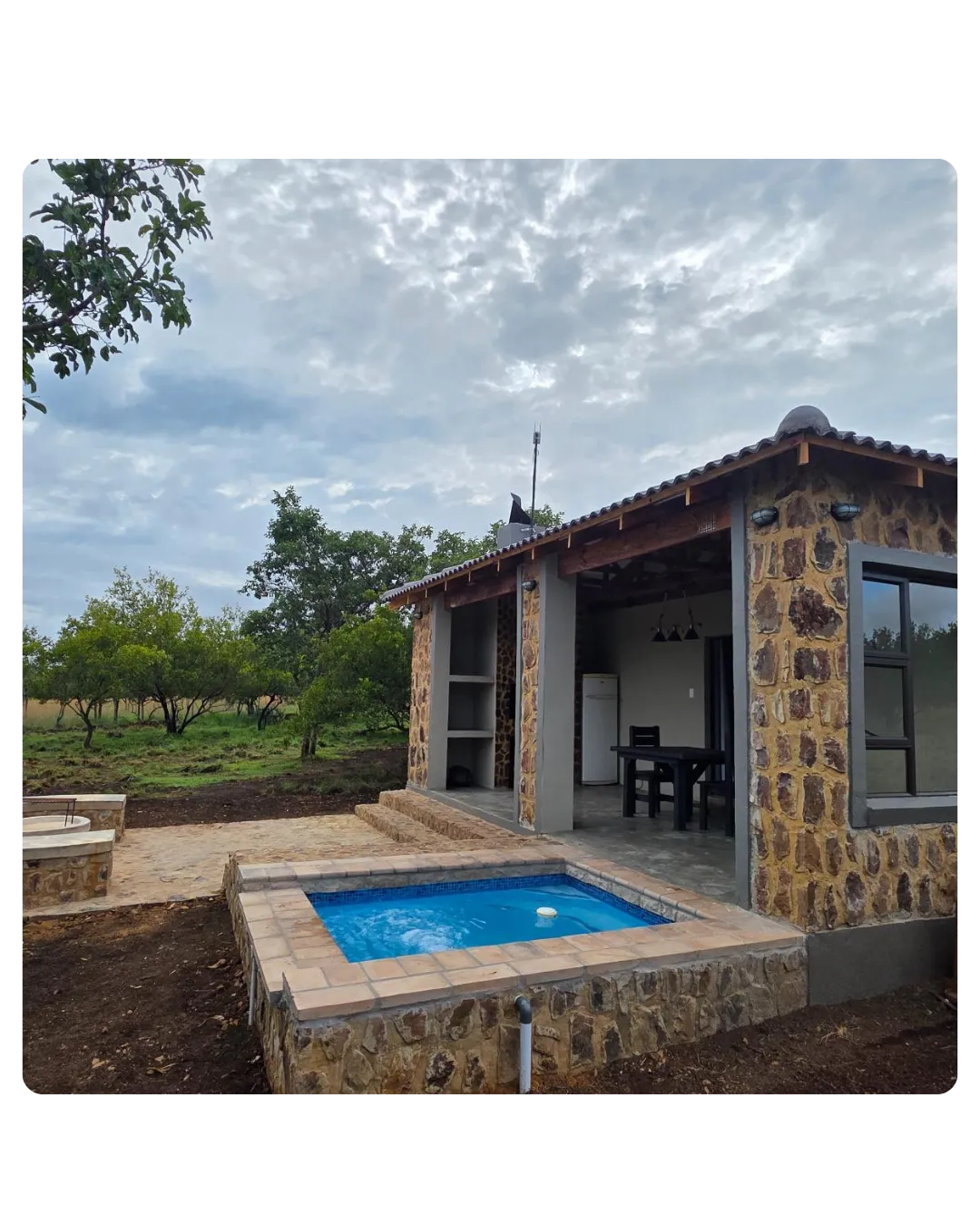 Cozy 4-sleeper with indoor braai, private pool and boma area.