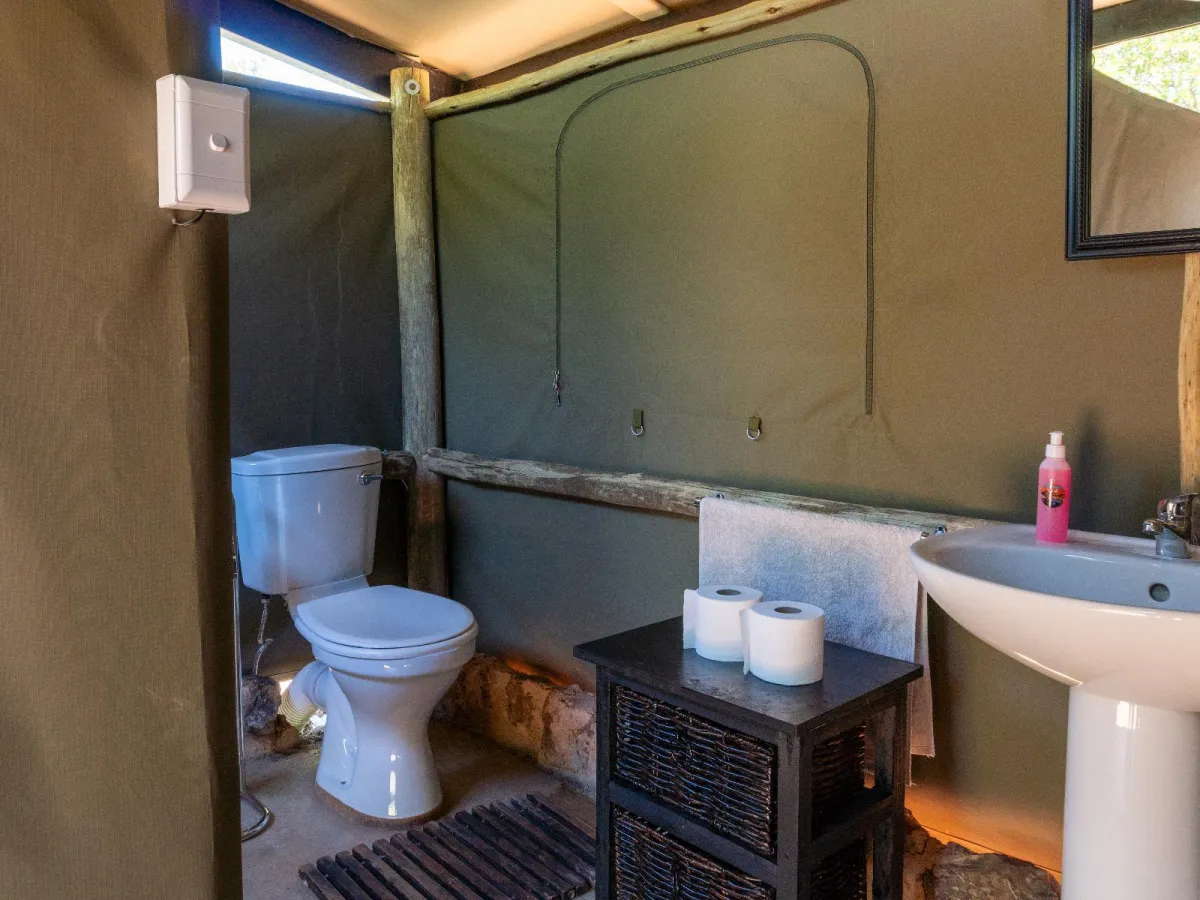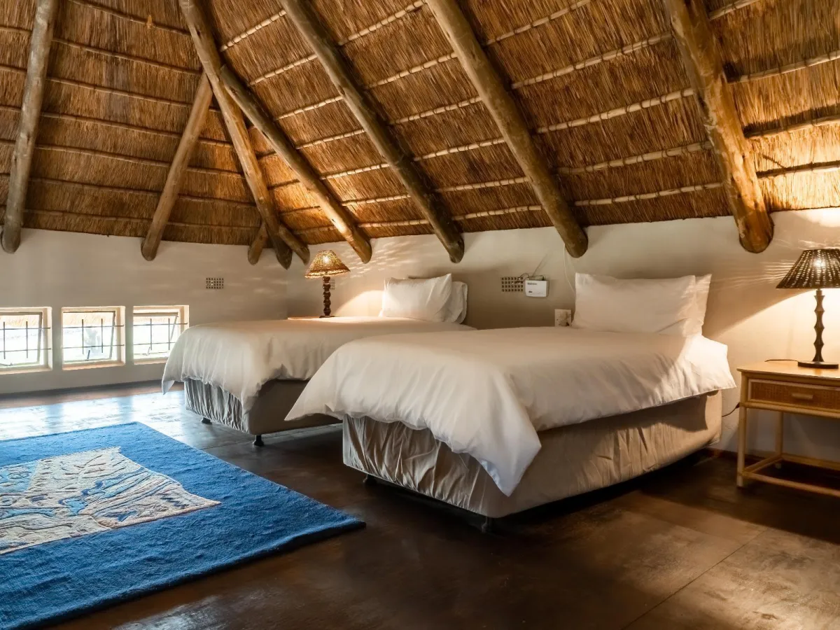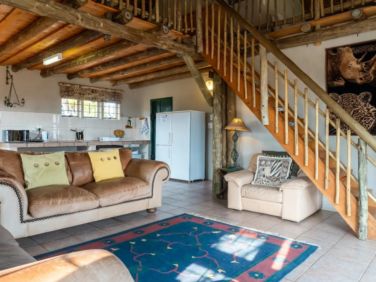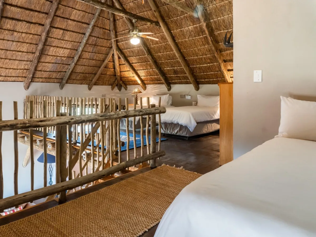 The main bedroom features a double bed with stunning bushveld views, while the loft bedroom includes a second double bed and two single beds — making it ideal for both adults and children. The bathroom is fitted with a shower, basin, and toilet.
