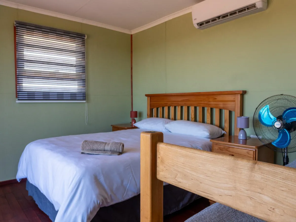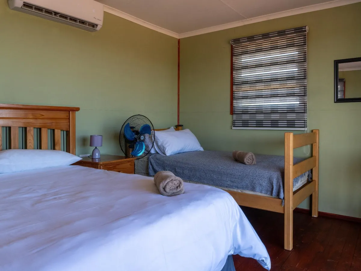 The main bedroom is furnished with a double bed, while the second bedroom has 2 single beds — perfect for kids or friends. The bathroom includes a walk-in shower, toilet, and basin. The kitchen is fully equipped with a fridge, microwave, stovetop, kettle, toaster, cutlery, and crockery, while the private braai area invites you to enjoy evenings under the stars.